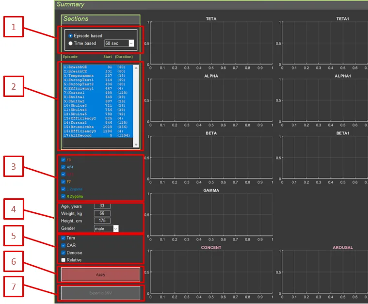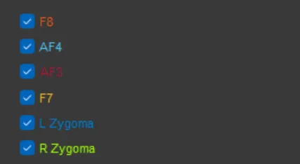 Checkboxes for displaying data from each EEG/EMG electrode (F8, AF4, AF3, F7, L Zygoma, R Zygoma).