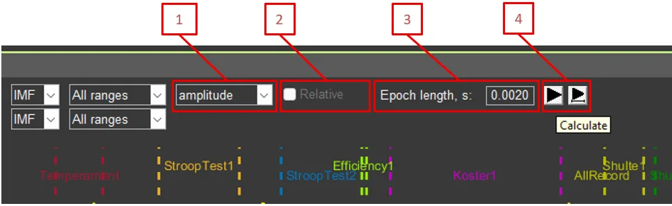 - Recalculation buttons (left button returns graph scaling to 100%; right button keeps the same signal fragment)