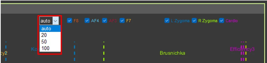 Drop-down list for setting a fixed Y-axis scale for EEG channels (auto, 20, 50, 100 µV).