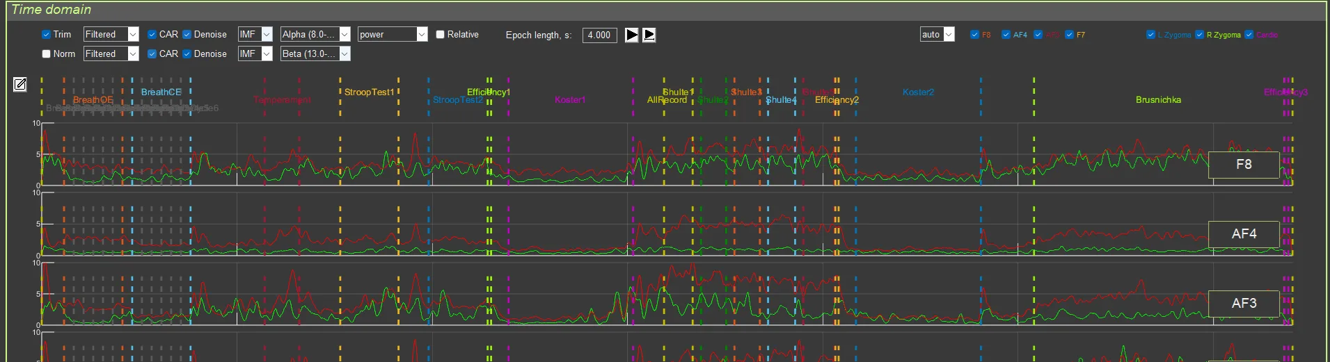 - Graph 2: Filtered + CAR + Denoise (blink artifacts) + Beta filter (13–30 Hz) + Power + Epoch length 4 s