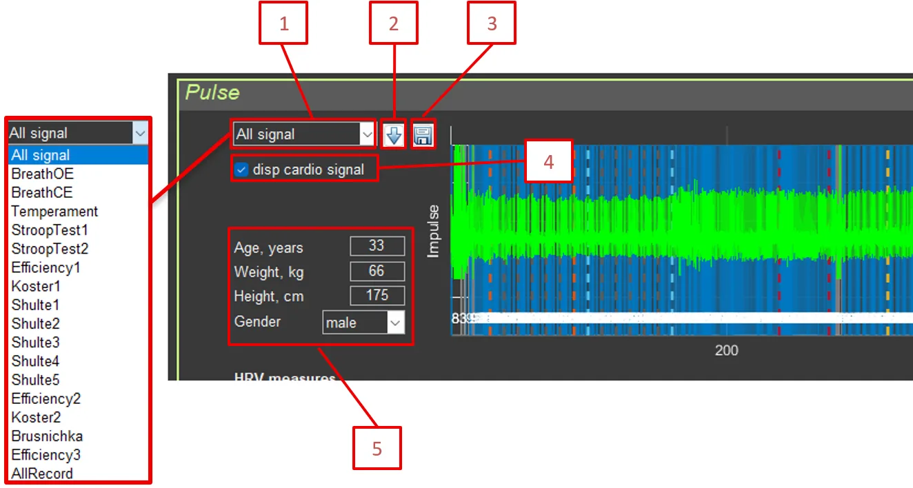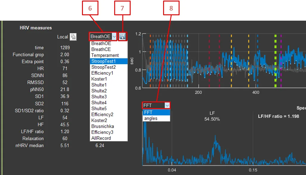 - Calculate HRV measures: Button for recalculating HRV metrics on the ECG segment selected in Sector