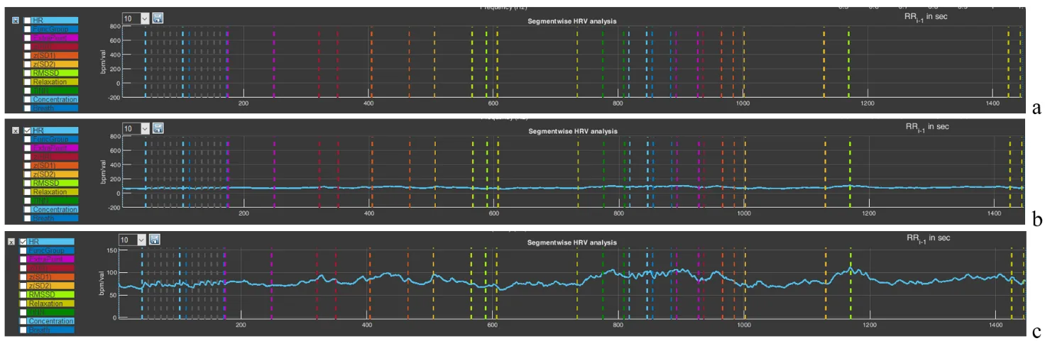 Now let us consolidate the already familiar skills of using the functional capabilities for controlling the image. Click on the cross in the upper left corner of the panel with the list of graphs in sector 8 (see the figure in Table 2). As we remember, it clears all images on the plot (Fig. 2.27a). Activate the graph of the indicator that interests us, for example, HR (Fig. 2.27b). Using the “+” icon (“Zoom In”), scale the graph along the vertical axis so that the dynamics of the indicator are visible (Fig. 2.27c).