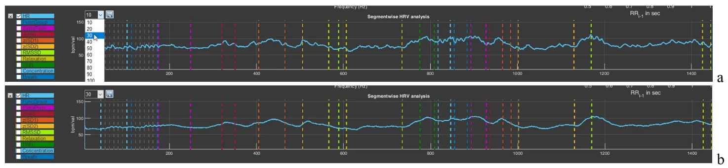 The window with the number 10 will allow you to build a graph with averaging of the number of points specified in the window. By default, a graph is built with averaging of 10 points. But you can select a larger number of points for averaging (Fig. 2.28a). This will lead to “smoothing” of the graph (Fig. 2.28b), which is sometimes useful if the spread of instantaneous values is large, which makes it difficult to see the general trend of changes in the indicator during a VR session.