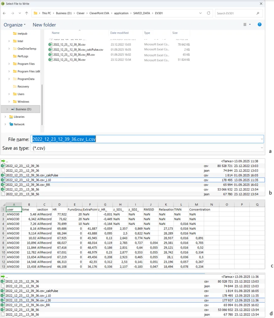 The last functional icon in the form of a floppy disk is also familiar to you: the function of saving data in tabular form. Press it (Fig. 2.29a). You are prompted to save the data under the name of the main file with “_L” added (Fig. 2.29a). Save it. A file with a “tail” in the name “_L10” will appear in the main folder (Fig. 2.29b). 10 is the value of the averaged number active in the window we told you about above. If you select, for example, the value “30” there, then your file will be saved with the “tail” “_L30” in the name (Fig. 2.29d).