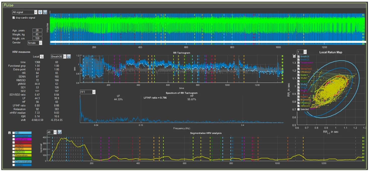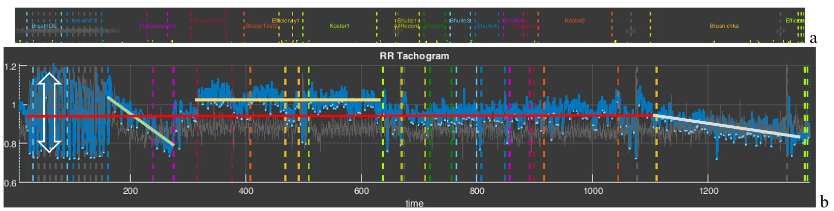- a relatively low heart rate (HR), which is fairly stable throughout the entire testing time (the red line of the mean RR-interval duration is approximately at the level of 0.95 s, or, converted to HR, 63 beats/min);