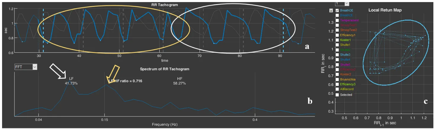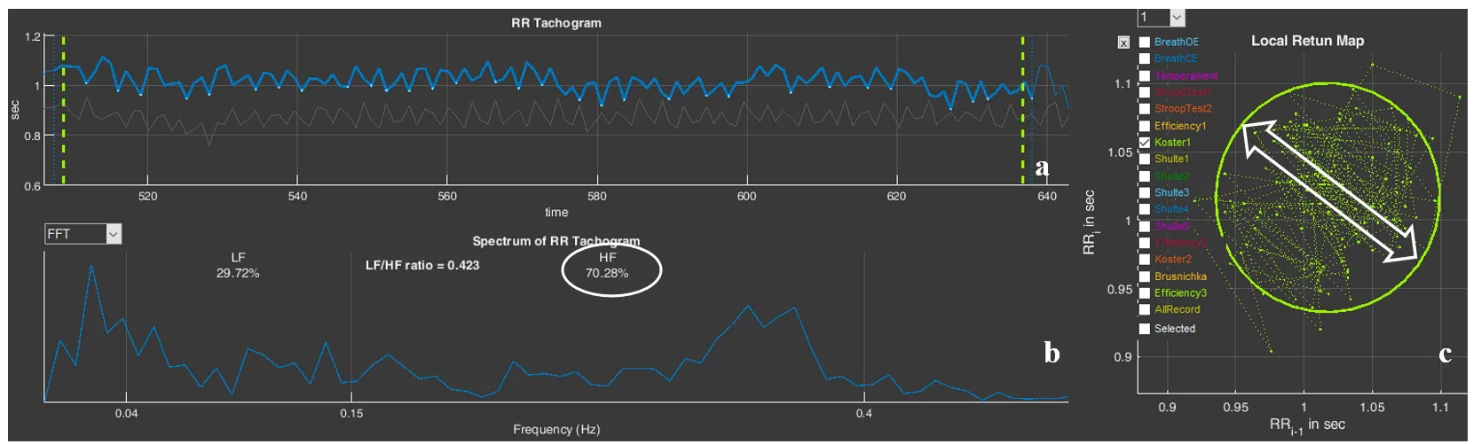 Figure 3.24. The respondent’s “Koster1” stage (Example 2): a – cardiointervalogram; b – spectrogram; c – scatter plot
