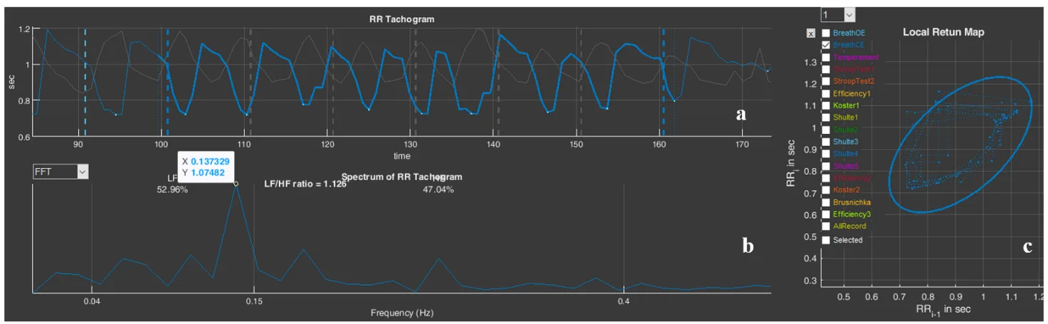 Figure 3.21. The respondent’s “BreathOE” stage (Example 2): a – cardiointervalogram; b – spectrogram; c – scatter plot