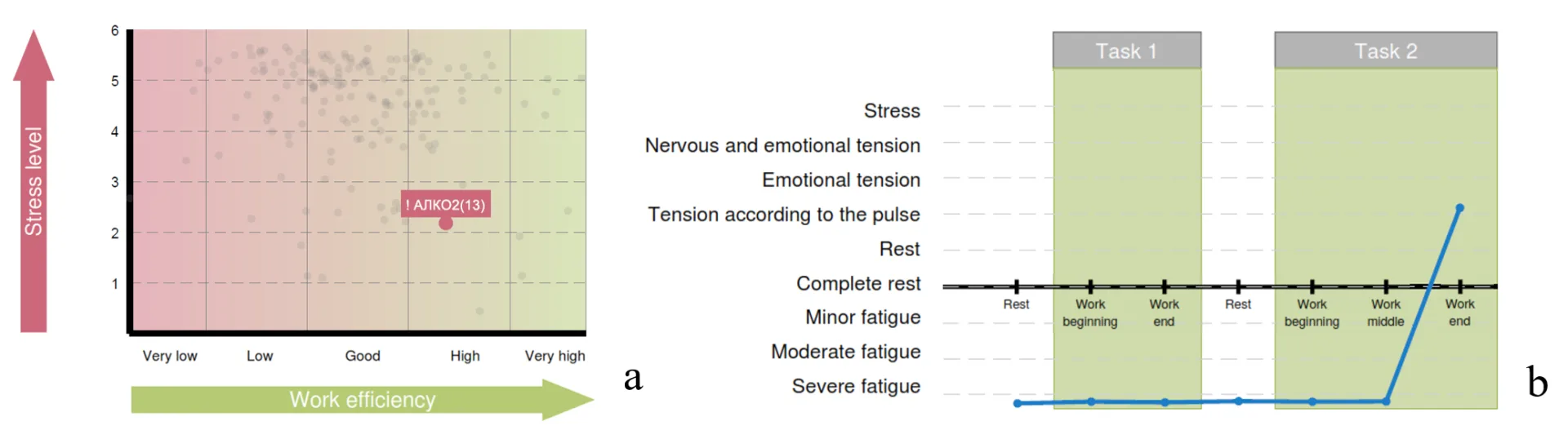 Figure 3.23. Diagrams of Chapter 3 of the report (Example 2): a – the functional type of performance support; b – the respondent’s functional states in the process of performing test tasks