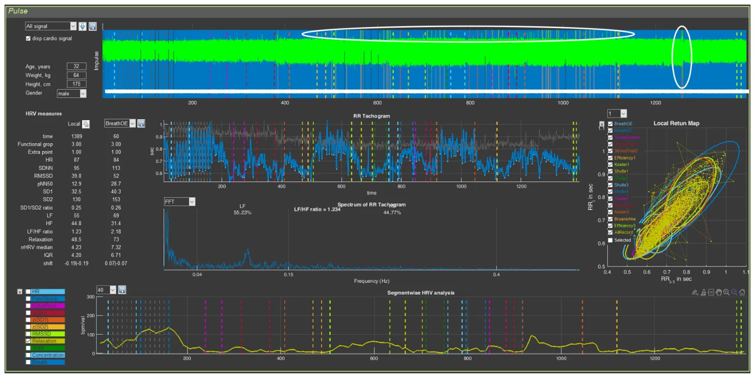 Recording quality? There are problems (Fig. 3.25): a segment of the recording defect on the last test is highlighted by a vertical oval, and single defects at the rest stages and Schulte tables are highlighted by a horizontal oval. A detailed analysis showed that these problematic segments of the recording do not have a significant effect on the overall picture.