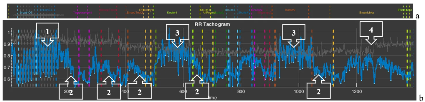 For clarity, let us present the CIG in a separate image and mark the zones of our attention (Fig. 2.26): 1 – during controlled rare breathing, high-amplitude waves of respiratory arrhythmia are clearly visible; 2 – a mobile reaction to the beginning of various psychometric tests with an HR shift toward tachycardia (up to 100 beats/min); 3 – during the proposed rest periods, recovery of a more slowed rhythm of heart contractions is noted (down to 70 beats/min); 4 – the cardiac-rhythm reaction during the last test is similar to that described at the beginning of this chapter (see Fig. 3.2).