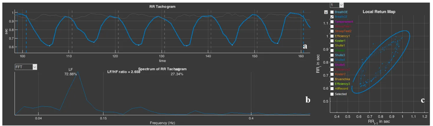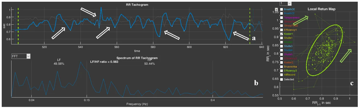 Figure 3.29. The respondent’s “Koster1” stage (Example 3): a – cardiointervalogram; b – spectrogram; c – scatter plot