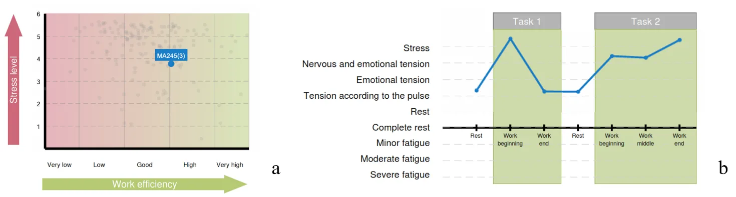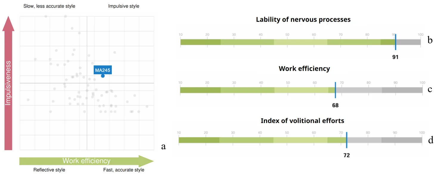 2. Mobility of nervous processes, according to the report (Fig. 3.28b), is high, which is emphasized by the autonomic reaction to the beginning of cognitive tests and the identified cognitive style (Fig. 3.28a). At the same time, work performance is above average (Fig. 3.28c).