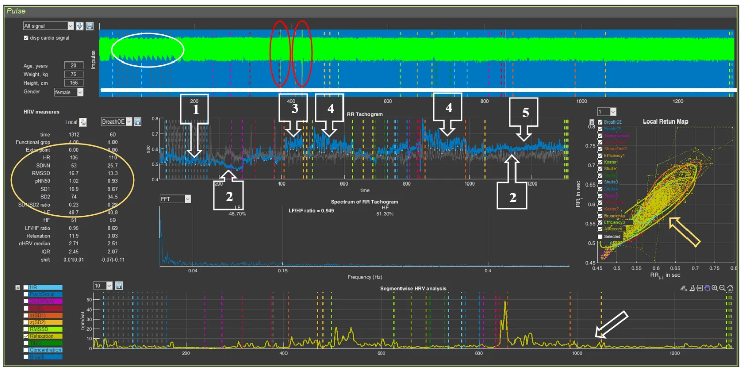 With a holistic perception of the “Cardio domain” page, the following points can be highlighted: 1. a state of pronounced anxiety, which manifested already at the beginning of the test and persisted throughout the VR session in the form of tachycardia (see the HR values in Fig. 3.31 in Sector 3); 2. extremely low heart rate variability, which manifests as a narrow shape of the CIG, elongated ovals of the scatter plots (yellow arrow) and is emphasized by the HRV indicator values (highlighted by a yellow oval in the figure); 3. an uncharacteristic reaction in the form of a slowing of the heart rhythm during the performance of a test associated with cognitive tension; 4. during the rest stages, HR decreases, but does not reach values characteristic of the norm (the mean cardiac-cycle duration is about 0.65 s, which corresponds to 92 beats/min); 5. during the last test, the respondent’s functional state stabilized, but at the level of about 100 beats/min. All this logically fits into the extremely low values of such an indicator as the rest state (in Fig. 3.31 in Sector 8 it is indicated by a white arrow).