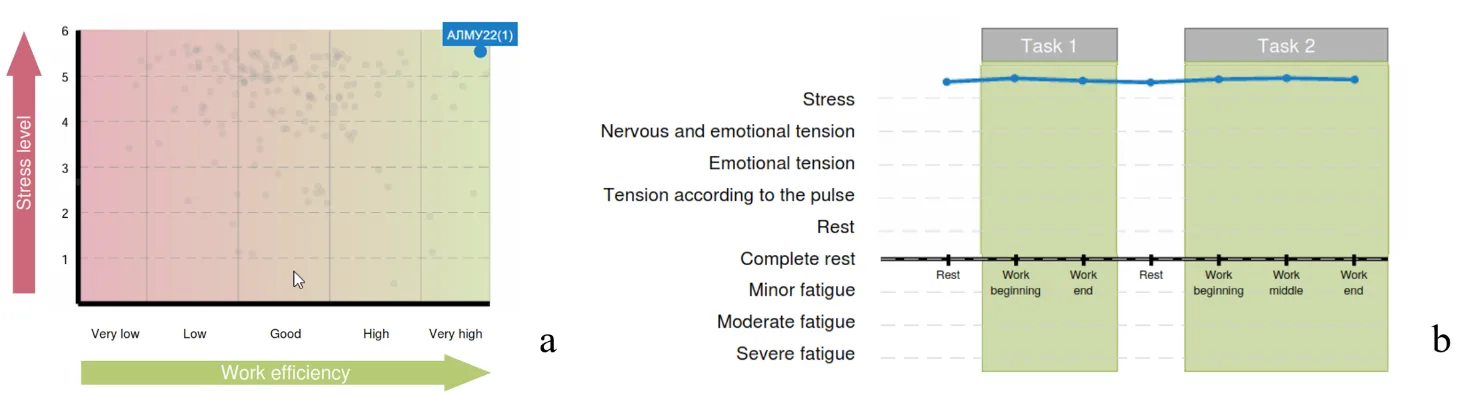 Figure 3.33. Diagrams of Chapter 3 of the report (Example 4): a – the functional type of performance support; b – the respondent’s functional states in the process of performing test tasks